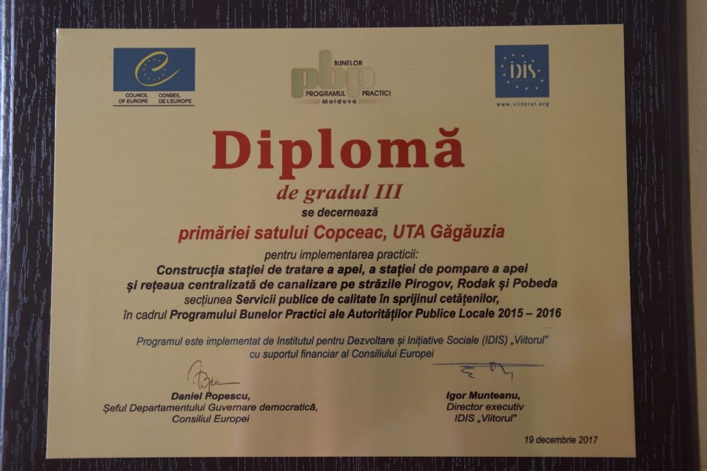 В рамках номинации «Услуги общественного качества для поддержки населения» примэрии Копчака был вручен диплом, за успешное строительство и подключение центральной канализационной системы на 3-х улицах, а именно Пирогова, Родака и Победа.