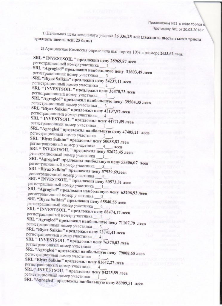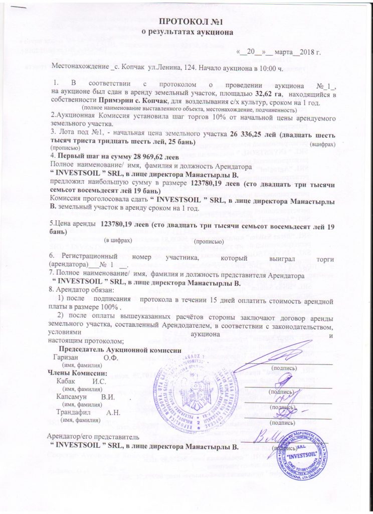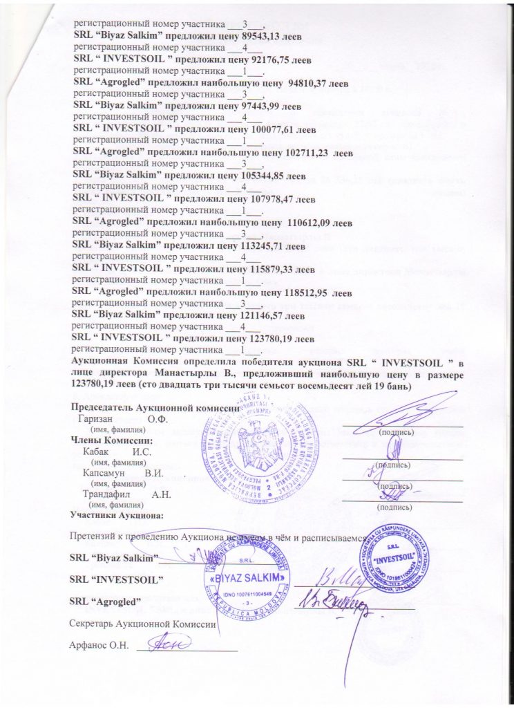 Аукционная комиссия определила победителя аукциона — SRL «Investsoil» в лице директора Валерия Манастырлы, предложивший наибольшую сумму в размере 123 780,19 леев (сто двадцать три тысячи семьсот восемьдесят лей, девятнадцать бань)