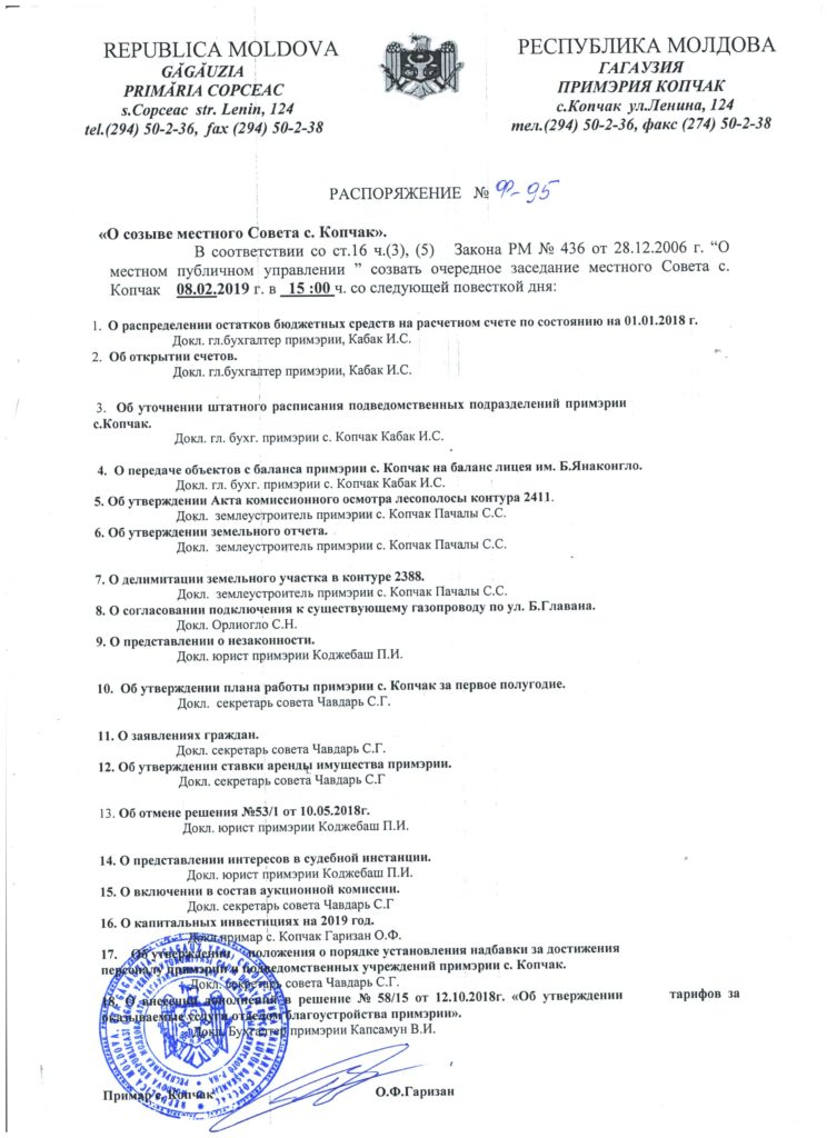 Распоряжением примара заседание местного совета созывается 8 февраля в 15:00 со следующей повесткой дня: