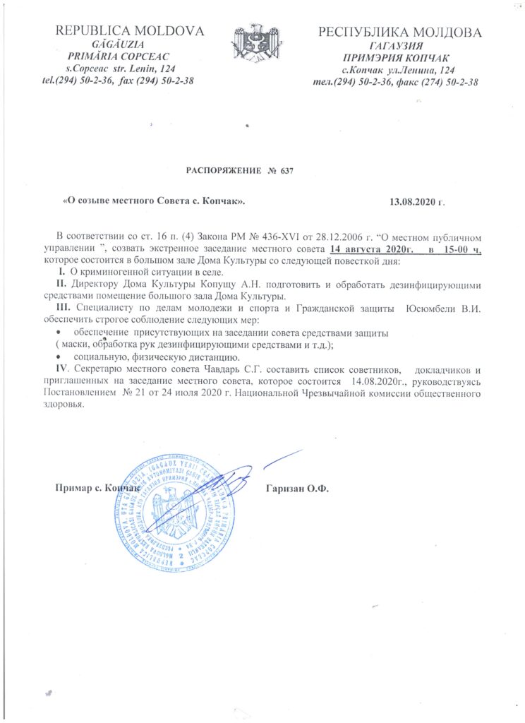 В соответствии со ст. 16 п. (4) Закона РМ № 436-XVI от 28.12.2006 г. “О местном публичном управлении ”, примар с. Копчак Олег Гаризан созывает экстренное заседание местного совета на 14 августа 2020 г. в 15-00, которое состоится в большом зале Дома Культуры.