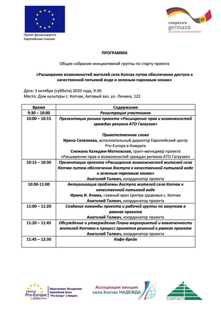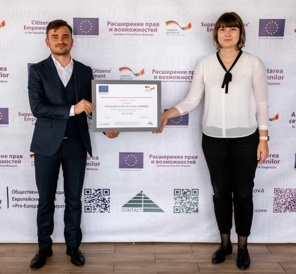 Программа местных грантов запускается на основе Единого механизма поддержки ЕС, предоставленного Республике Молдова (2017-2020 гг.) в рамках Европейского инструмента соседства, и внедряется в рамках проекта «Расширение прав и возможностей граждан в Республике Молдова» (2019-2021 гг.), который финансируется Европейским Союзом и реализуется Германским Агентством по Международному Сотрудничеству (GIZ).Региональными партнерами проекта по повышению вовлеченности граждан в регионе АТО Гагаузия является ОО Европейский Центр «Pro-Europa» в Комрате и Национальный Центр Поддержки и Информирования НПО в Молдове CONTACT.