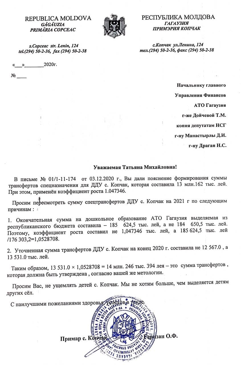 Обращение Олега Фёдоровича к Начальнику главного Управления Финансов АТО Гагаузия Дойчевой Т.М.