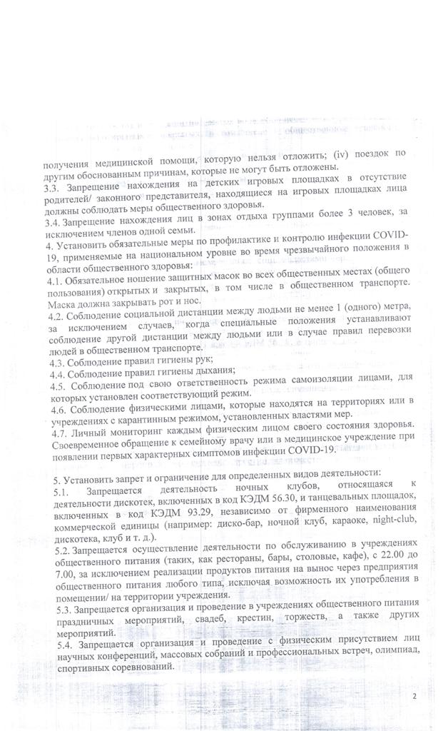 Продление чрезвычайного положения в области общественного здравоохранения сохраняет и вводит некоторые запреты: проведение церемоний; частичное обучение в школьных учреждениях, запрет деятельности ночных клубов, дискотек, ограничения нахождения на детских площадках, в зонах отдыха и т. д.