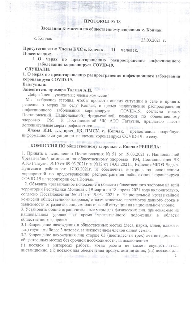 В Молдове до 18 апреля 2021 года, продлили чрезвычайное положение в области общественного здравоохранения. Соответствующее решение приняла и чрезвычайная комиссия общественного здоровья с. Копчак на заседании от 23 марта 2021г.