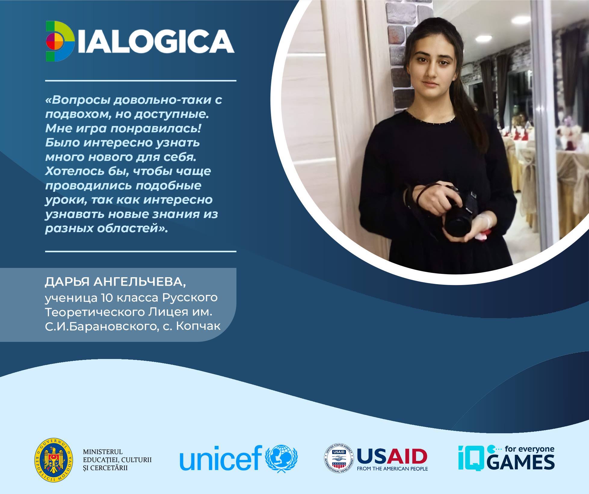 Ученица лицея отмечена Ассоциацией интеллектуальных игр за креативный комментарий в рамках проекта «Предупрежден — значит вооружен!»Информационную кампанию разработала Ассоциация интеллектуальных игр РМ. Она проходит при поддержке UNICEF Moldova из средств USAID Moldova в сотрудничестве с Министерством образования, культуры и исследований Республики Молдова.
