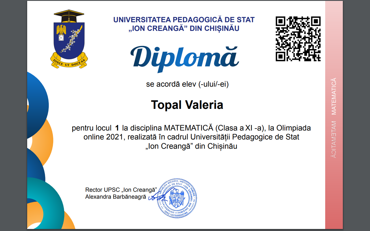 Ученица лицея Топал Валерия приняла участие в олимпиадах, которые проводились кишиневским университетом. В начале апреля классный руководитель отправил в чат класса ссылку на участие в олимпиадах. Валерия заполнила две заявки(по английскому и математике) и благополучно забыла об этом). Через месяц в один день после школы она получила задания по математике на почту, которые должна была выполнить в этот же день за ограниченное время и отправить ответы. А спустя несколько дней участники олимпиады писали английский перед камерами.
