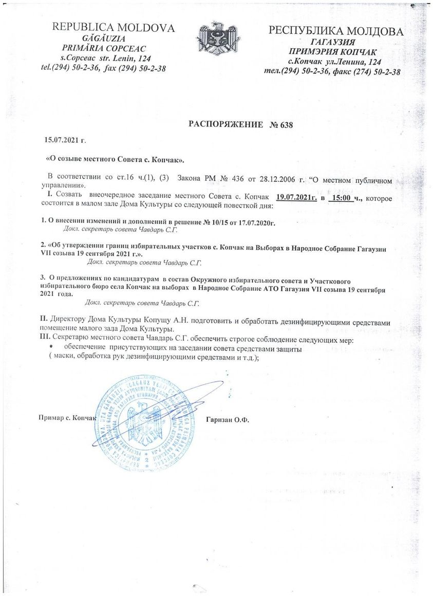 Внеочередное заседание местного Совета с. Копчак 19.07.2021г. в 15:00 ч., которое состоится в малом зале Дома Культуры со следующей повесткой дня: 1. О внесении изменений и дополнений в решение № 10/15 от 17.07.2020г. 2. «Об утверждении границ избирательных участков с. Копчак на Выборах в Народное Собрание Гагаузии VII созыва 19 сентября 2021 г.». 3. О предложениях по кандидатурам в состав Окружного избирательного совета и Участкового избирательного бюро села Копчак на выборах в Народное Собрание АТО Гагаузия VII созыва 19 сентября 2021 года.