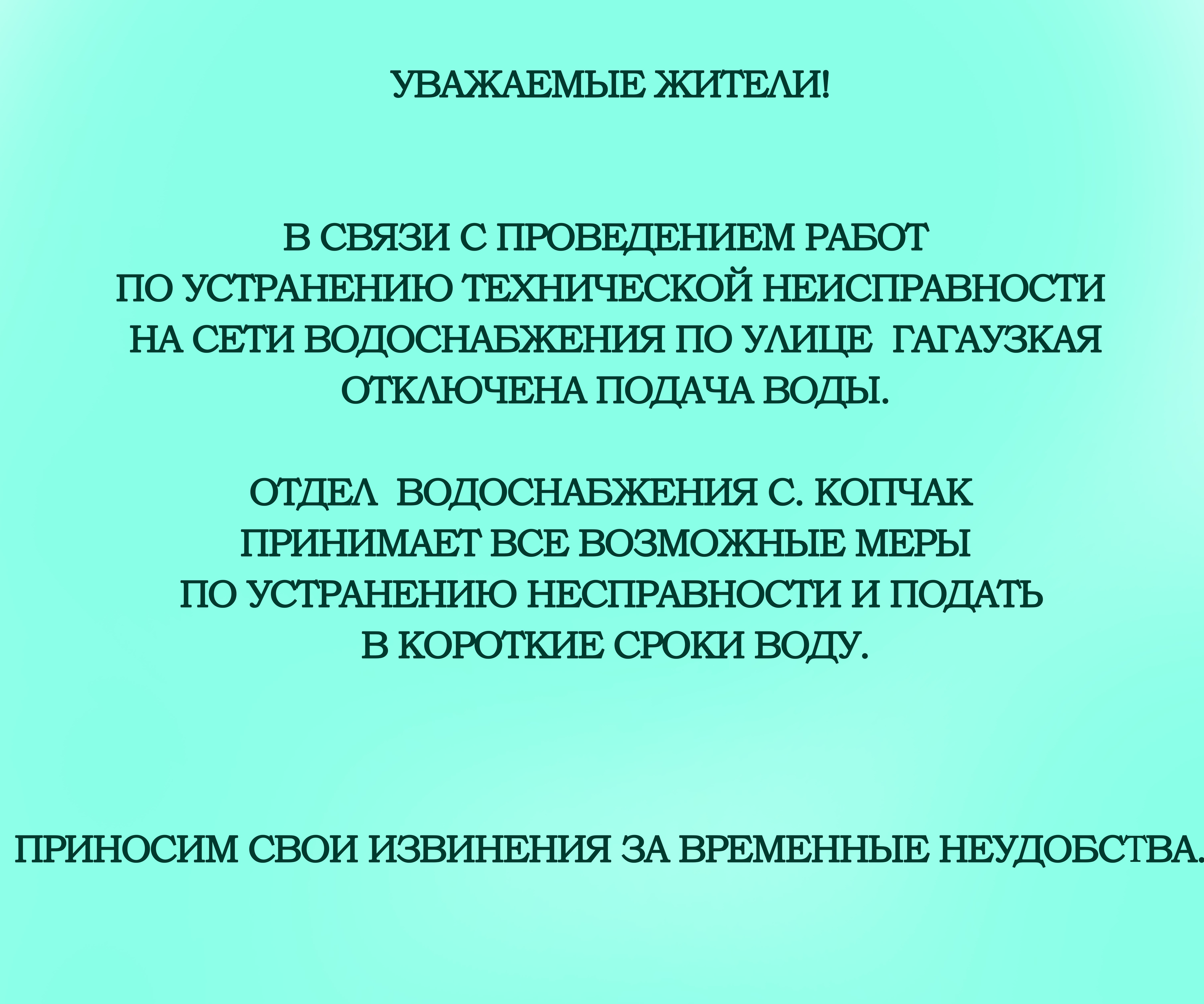 В связи с проведением работ по устранению технической неисправности на сети водоснабжения по улице Гагаузкая, отключена подача воды. отдел водоснабжения села Копчак принимает все возможные меры неисправности и подать в короткие сроки воду.