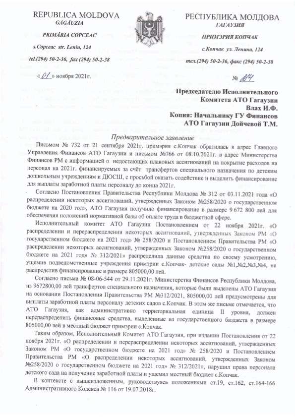 Примэрия Копчака обратилась к Башкану Гагаузии и начальнику Главного управления финансов Гагаузии.