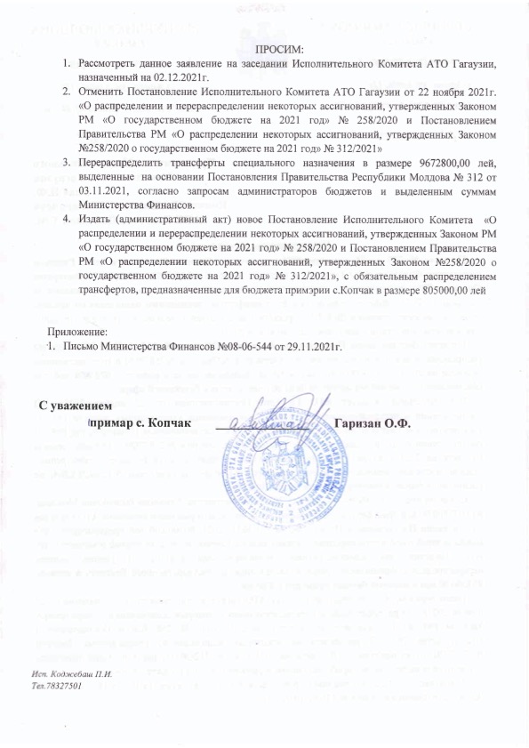 (док) Примэрия Копчак просит Исполком выплатить в местный бюджет 805 тыс. лей на з/п сотрудникам Детских садов