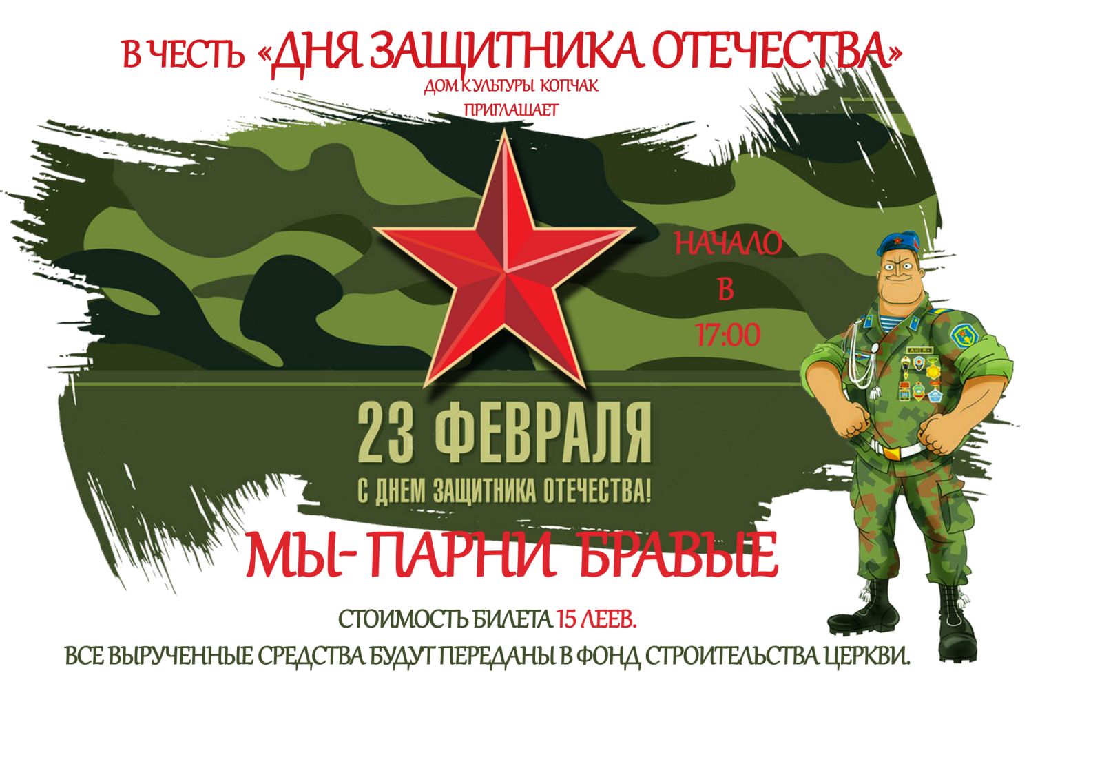 В честь замечательного праздника «Дня Защитников Отечества» Дом культуры с. Копчак организует праздничное мероприятие – конкурсную программу «Парни бравые» между командами сборной лицеев с. Копчак и лицеем им. В. Мошкова из г. Чадыр-Лунга.
