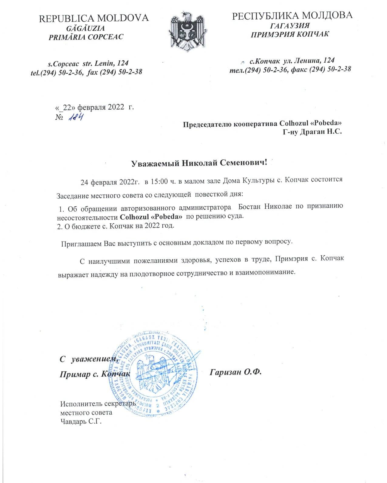 Приглашение на заседание местного совета председателя Кооператива «Колхоз Победа» Драган Николая Семеновича об авторизованного администратора Бостан Николае по признанию несостоятельности «Колхоза Победа» по решению суда.