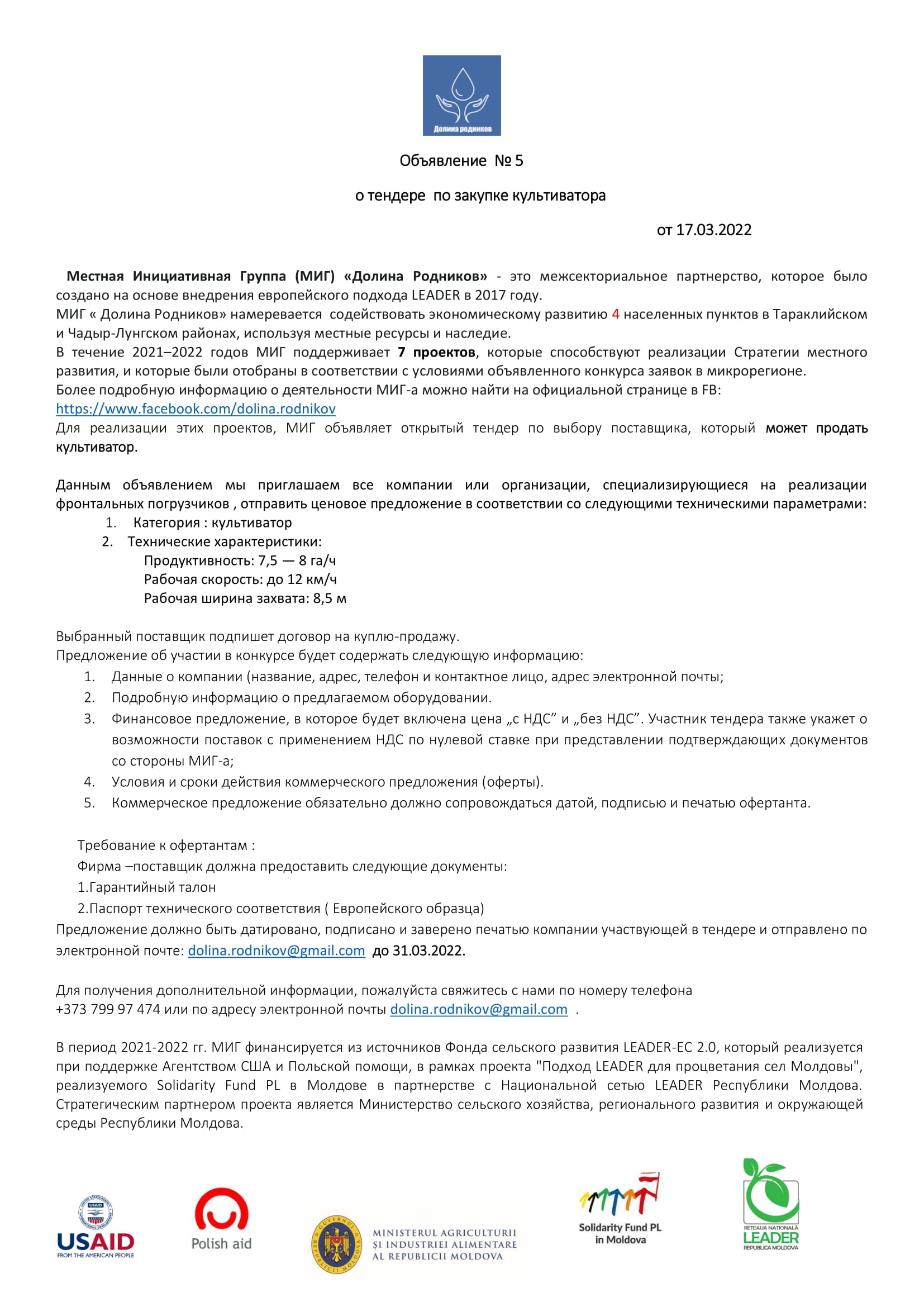 Для реализации этих проектов, МИГ объявляет открытый тендер по выбору поставщика, который может продать культиватор.