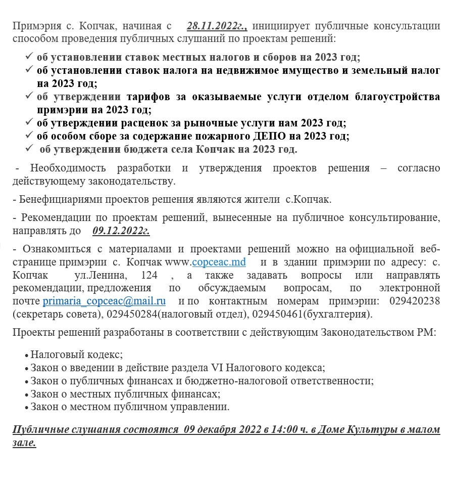 Примэрия с. Копчак, начиная с 28 .11.2022г. , инициирует публичные