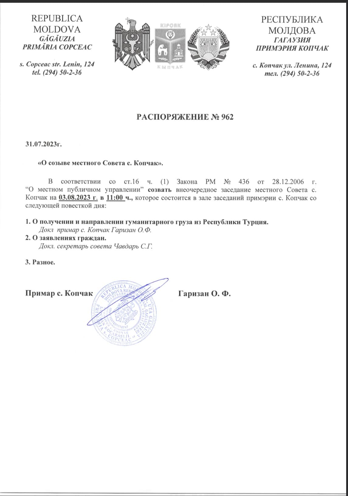Объявление о внеочередном заседании совета которое состоится 3 августа 2023 года в зале заседаний примарии с. Копчак в 11:00.